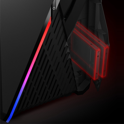 Dos bahías SSD de intercambio en caliente hacen que la conmutación de discos duros sea sencilla y sin estrés. Si bien los sistemas típicos requieren que abra el chasis para cambiar las unidades, las bahías de intercambio en caliente le permiten agregar o reemplazar rápidamente SSD secundarios sin interrumpir su flujo. Organizar torneos multijugador es más rápido y fácil, ya que los jugadores pueden intercambiar rápidamente unidades para cargar configuraciones personalizadas, y se pueden configurar nuevos juegos en cada estación con un tiempo de inactividad mínimo entre partidas.